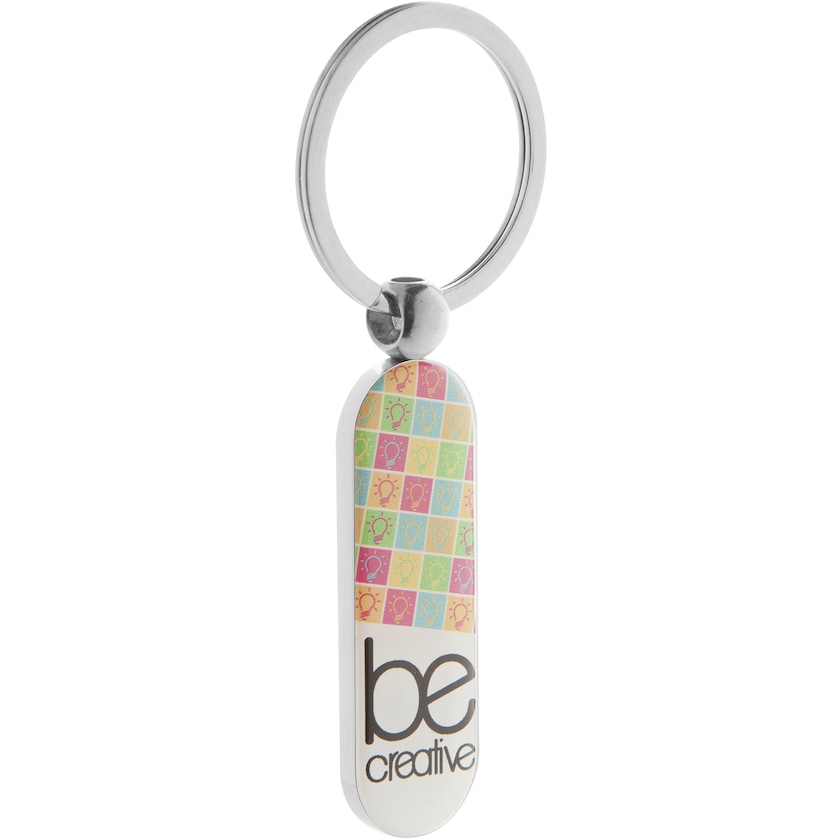 Porte-clé en métal oval avec impression en quadrichromie. Le porte-clé est joliment chromé et livré dans une boîte cadeau noire.