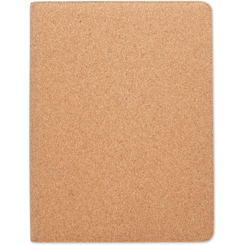 Carnet de conférence au format A4 avec couverture en liège véritable. A l'intérieur se trouve un bloc-notes avec 30 feuilles lignées de papier recyclé. Un stylo assorti est inclus.