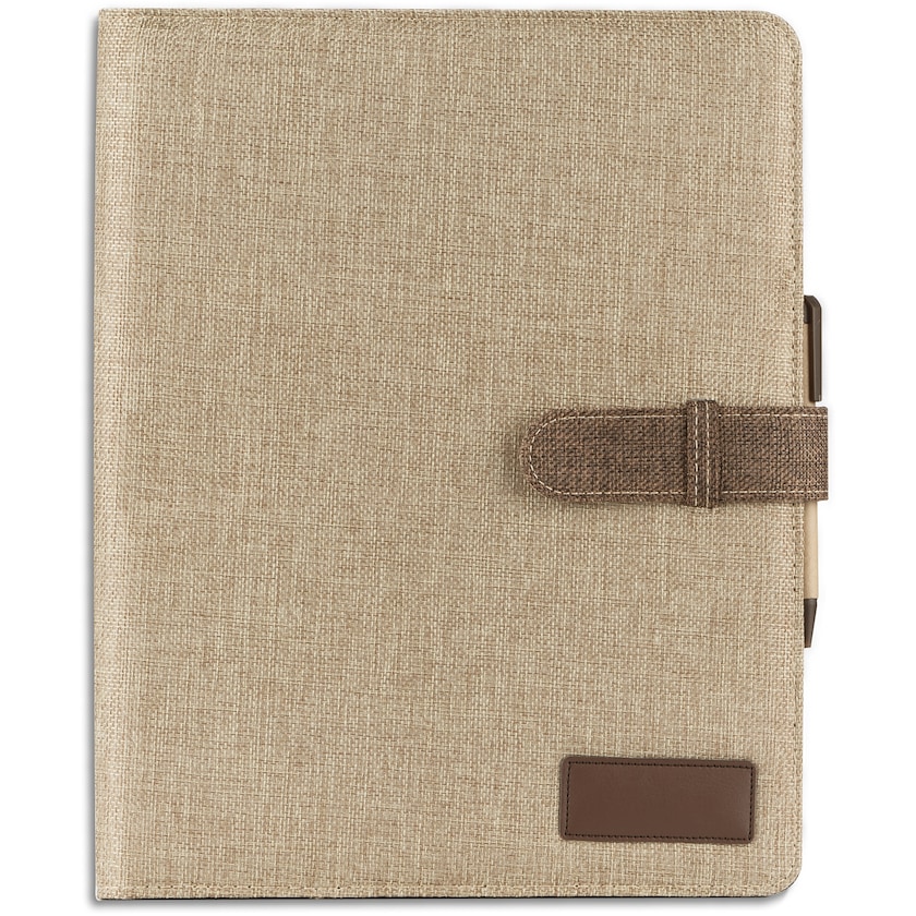 Porte-documents couleur nature en coton. Le porte-documents comporte plusieurs compartiments et poches. La personnalisation est effectuée sur la marque en cuir synthétique en bas à gauche du porte-documents.