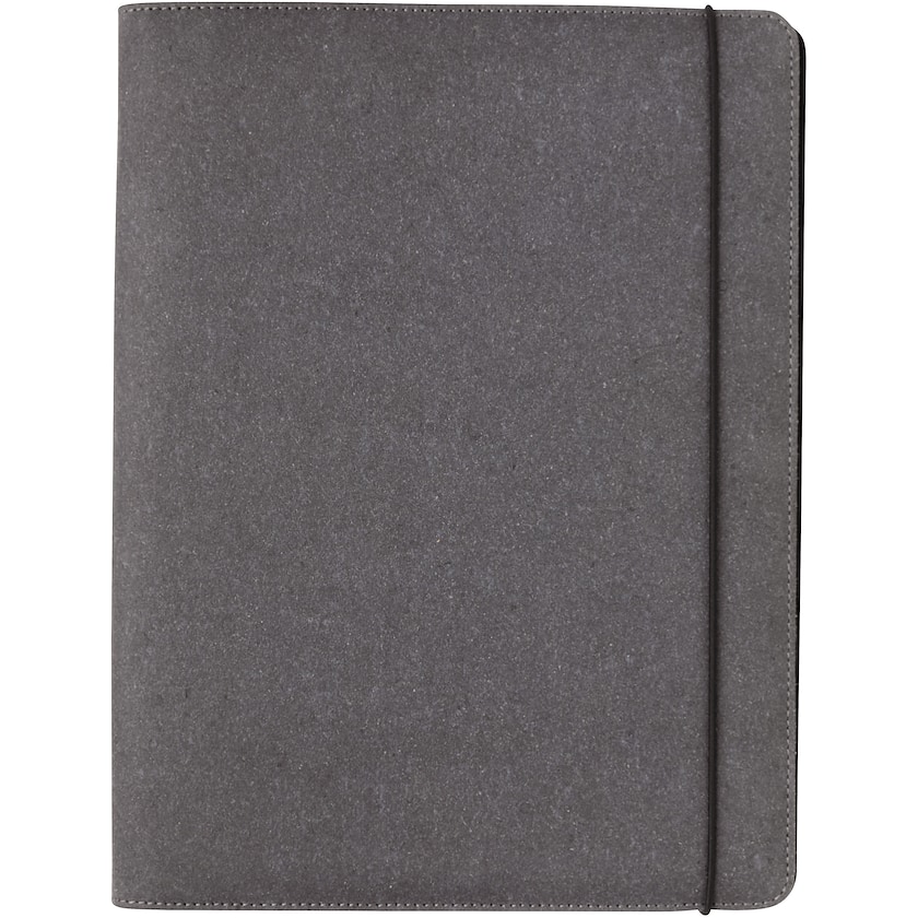 Porte-documents en cuir recyclé. Il contient un bloc-note A4 de pages en papier recyclé, et des compartiments pour ranger téléphone portable et cartes de visite. Il comporte également une grande poche de rangement. Livré dans une boîte cadeau couleur nature.