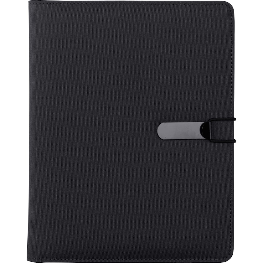 Porte-documents en rPET écologique au format A5. Le porte-document incult un bloc-note de 64 pages lignées en papier certifié FSC. La personnalisation est réalisée par impression monochrome ou par gravure laser.