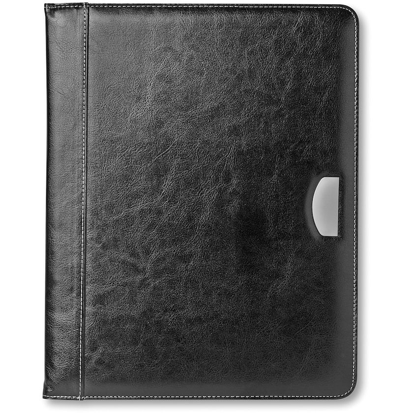 Porte-documents A4 en cuir synthétique. Livré avec un bloc-note de 20 feuilles. La personnalisation est effectuée soit par impression sur la surface en cuir, soit par gravure laser sur la plaque en métal.
