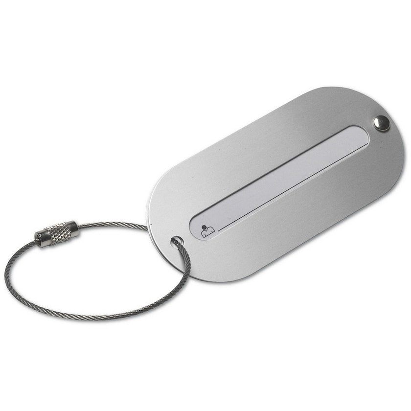 Porte-étiquette pour bagage ovale en aluminium avec de la place pour les informations personnelles.