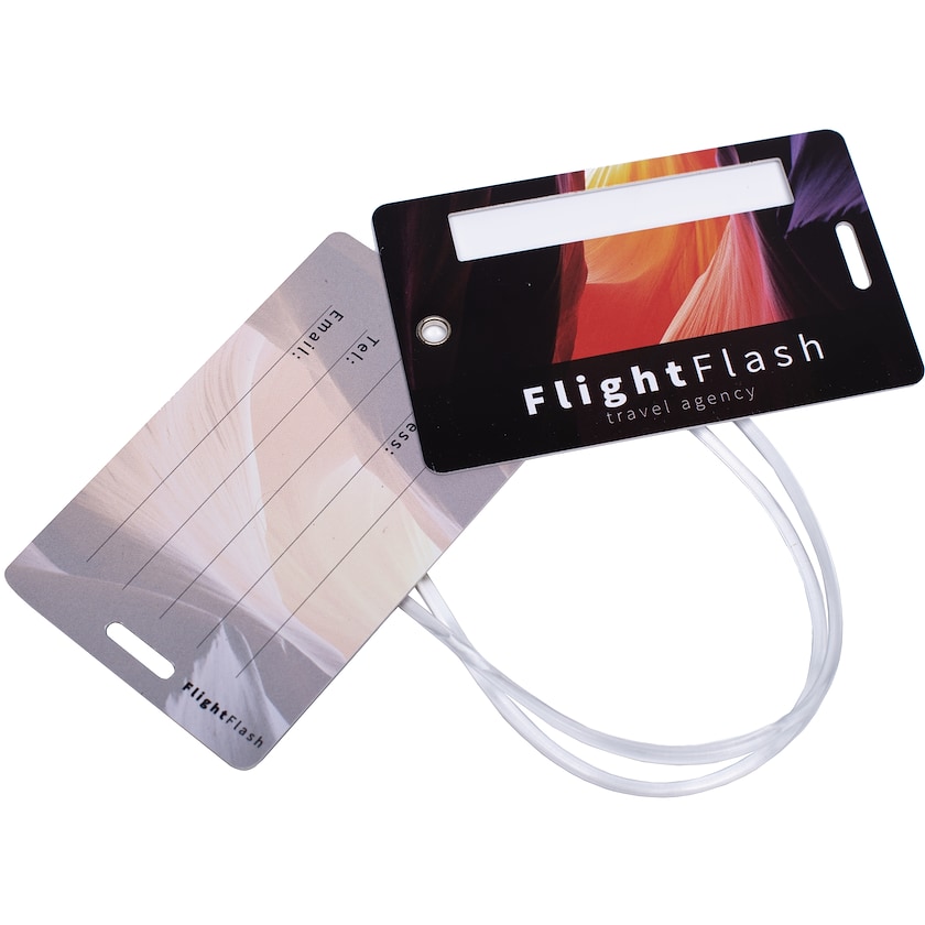 Étiquette de bagage sur mesure en PVC dur. Chaque étiquette de bagage contient deux cartes. Le prix d'impression correspond à une impression numérique sur toute la surface recto et verso des deux cartes. Lanière en caoutchouc incluse.
