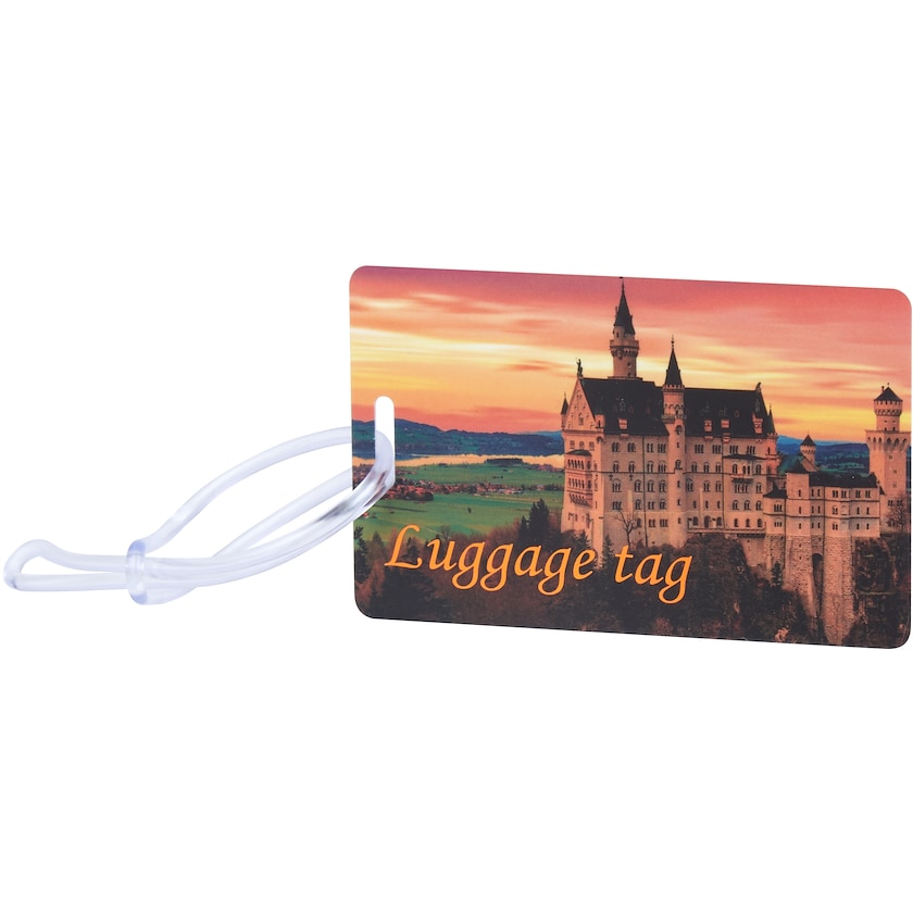 Porte-étiquette pour bagage avec impression photo en quadrichromie des deux côtés. Le porte-étiquette pour bagage a la même forme et la même taille qu'une carte de crédit. Son cordon en silicone permet de l'attacher au bagage.