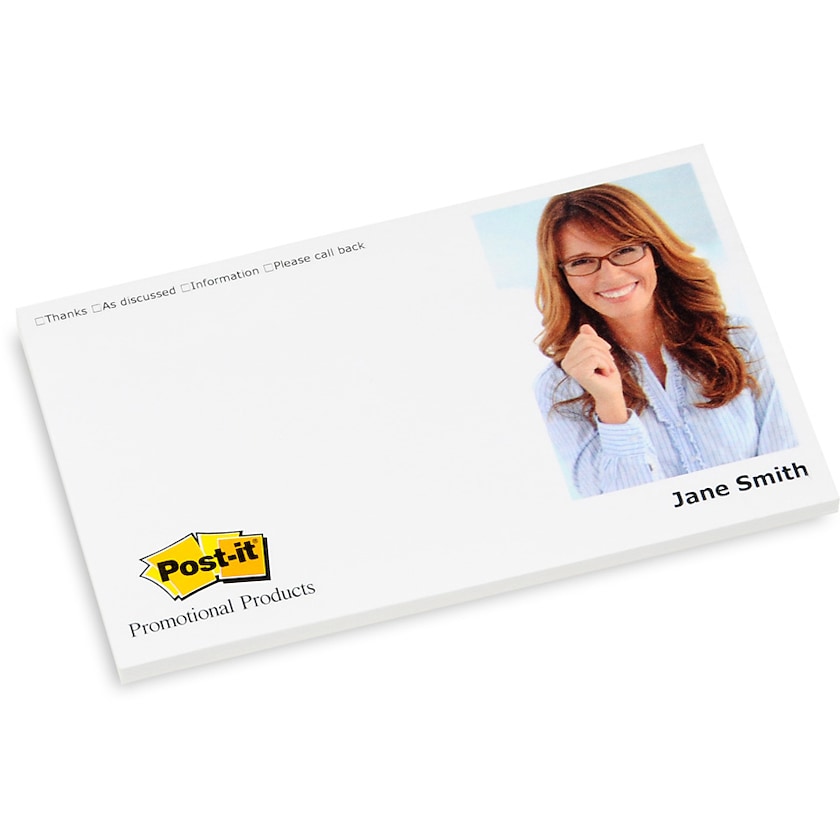 Post-it avec une surface d'écriture un peu plus large. Orné du logo de votre entreprise, il fera un support publicitaire imbattable. La bande adhésive se situe le long du bord long.