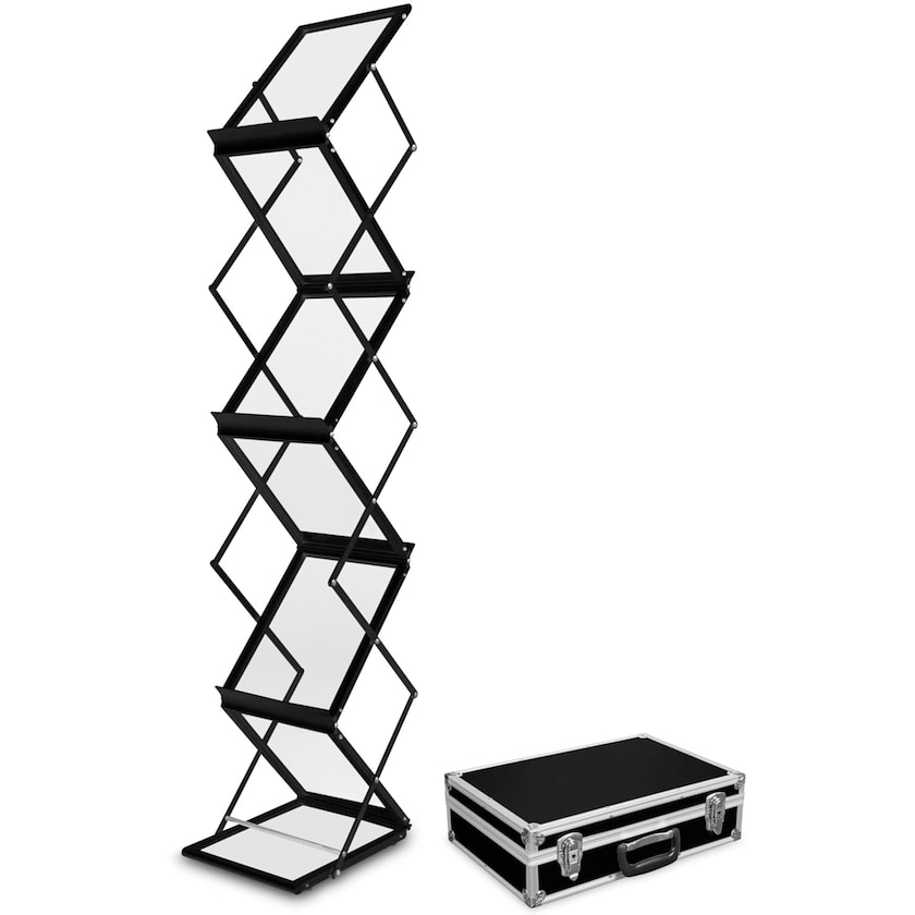 Présentoir Flex en aluminium noir nuit avec boîtier robuste. Le présentoir est en aluminium thermolaqué noir et est équipé de 6 compartiments pour brochures. Chaque compartiment mesure 30,5 x 22 cm. Déplié, le porte-brochures mesure 146 cm de hauteur. Plié, les dimensions sont de 17 x 54 x 47 cm. L'assemblage est rapide et ne nécessite aucun outil. Livré avec un étui de rangement robuste en aluminium. Garantie 1 an.