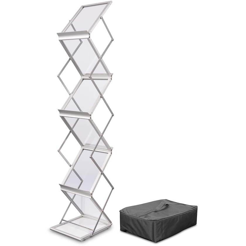 Elégant présentoir en aluminium. Flex Standard dispose de 6 compartiments pour brochures A4. Chaque compartiment mesure 30,5 x 22 cm. Déplié, le porte-brochures mesure 146 cm de hauteur. Plié, les dimensions sont de 11 x 25,6 x 40 cm. L'assemblage est rapide et ne nécessite aucun outil. Livré avec un sac de rangement pratique. Garantie 1 an.