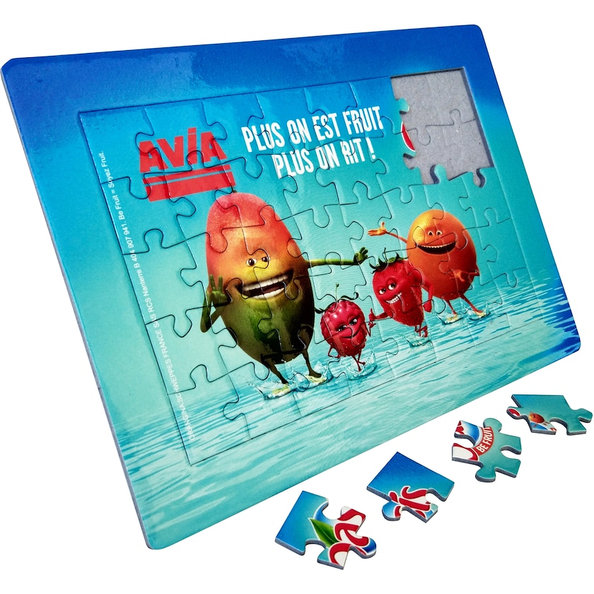 Puzzle de 40 pièces. Toute la face avant est imprimée en 4 couleurs suivant vos souhaits. Téléchargez le template et concevez votre propre puzzle!