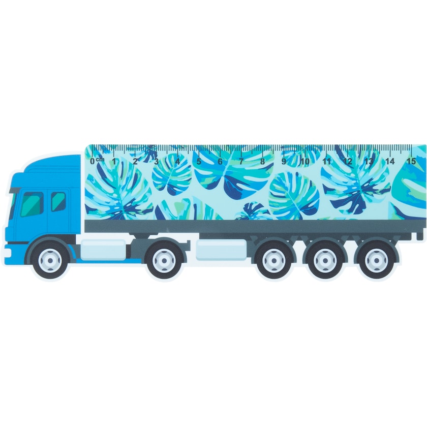 Règle de 15 cm en forme de camion. La personnalisation couvre toute la surface de la règle. Téléchargez le template d'impression et concevez vous-même l'intégralité du design. La règle est souple.