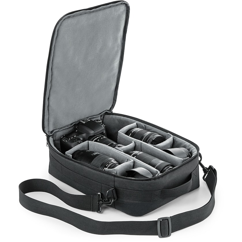Sacoche pour appareil photo avec compartiment de rangement pour un appareil, un objectif et divers accessoires de photographie. Le compartiment possède une structure en caoutchouc, pour des accessoires bien protégés contre les chocs et les coups. La bandoulière est ajustable et amovible.