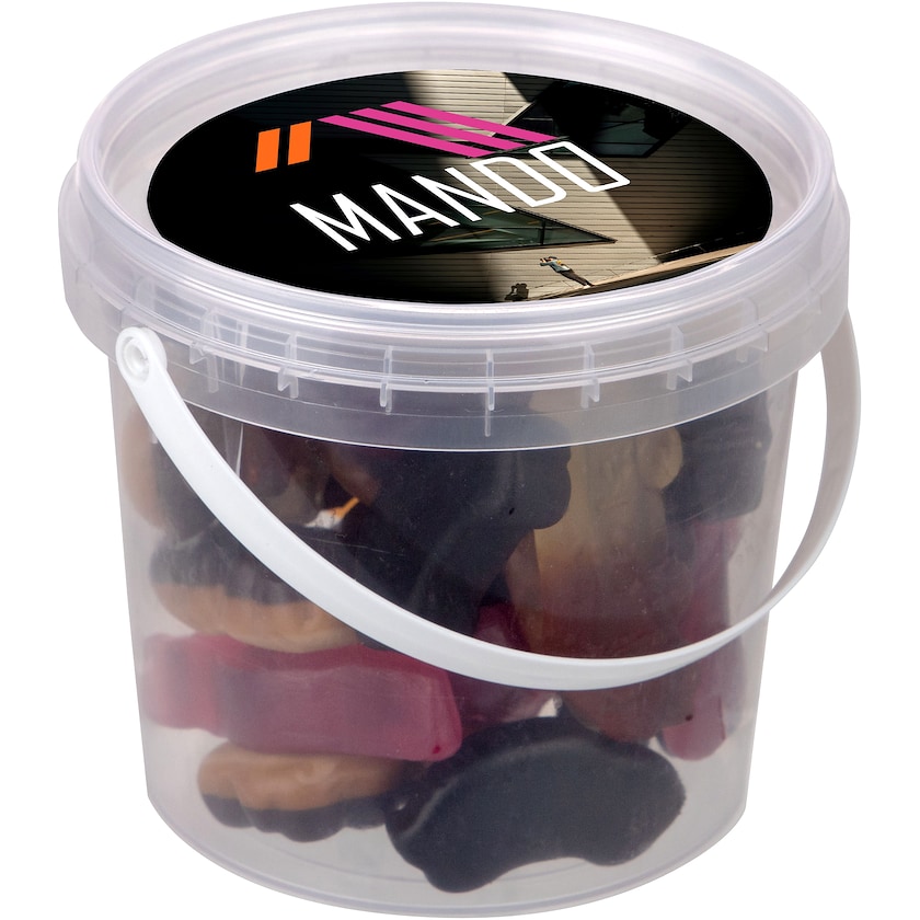 Un petit seau rempli de réglisse sur le thème de la voiture. La réglisse est disponible en plusieurs saveurs. Le marquage est réalisé par une étiquette imprimée numériquement sur le couvercle du seau.