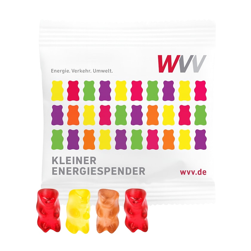 Sachet de 10 grammes d'oursons en gelée qui peut être commandé à partir de seulement 1000 unités. Les oursons en gelée ont un délicieux goût de fruit. Le sachet est personnalisable par impression photo 4 couleurs, entièrement suivant vos souhaits. L'emballage est fait de plastique blanc. Parfait pour les salons, les événements ou les expositions!