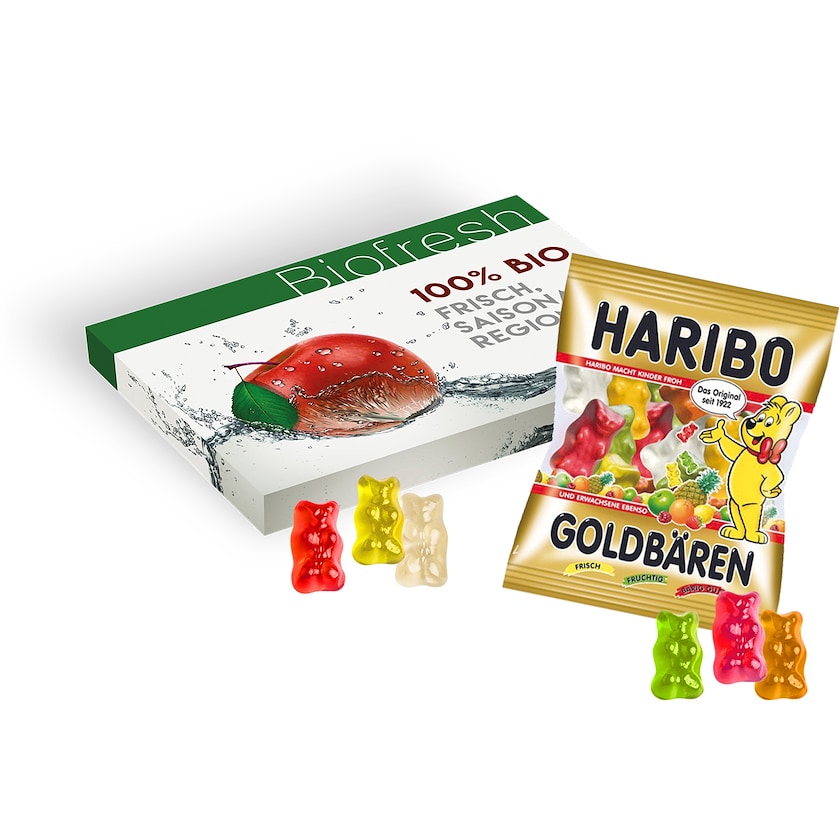 Boîte en carton contenant un sachet de bonbons Haribo. L'intégralité de la boîte en carton est personnalisée suivant vos souhaits. Choisissez parmi trois goûts différents.