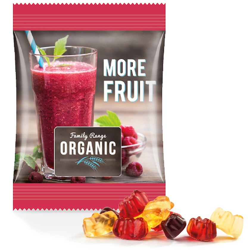 Ours en gelée haut de gamme qui contiennent pas moins de 30% de fruits. Les ours en gelée sont produits par le fabricant allemand réputé Trolli et ont six goûts différents. L'intégralité de l'emballage est personnalisé suivant vos souhaits.