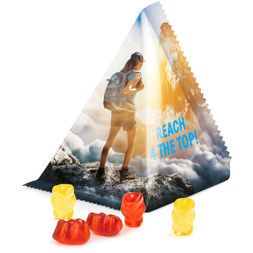 Pyramide contenant des ours en gelée ayant une teneur en fruits de pas moins de 30%. Les bonbons sont produits par le fabricant allemand réputé Trolli et ont six goûts différents. L'intégralité de l'emballage est personnalisé suivant vos souhaits.