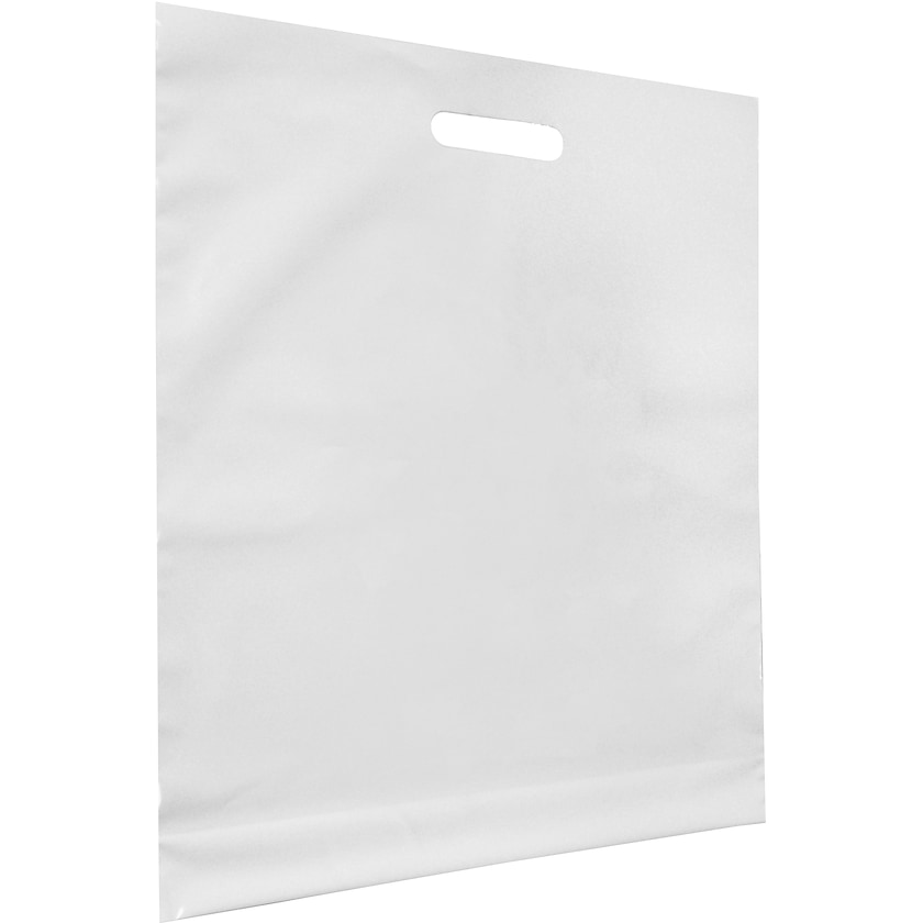 Grand sachet plastique blanc disponible avec imprimé personnalisé à partir de seulement 300 unités.