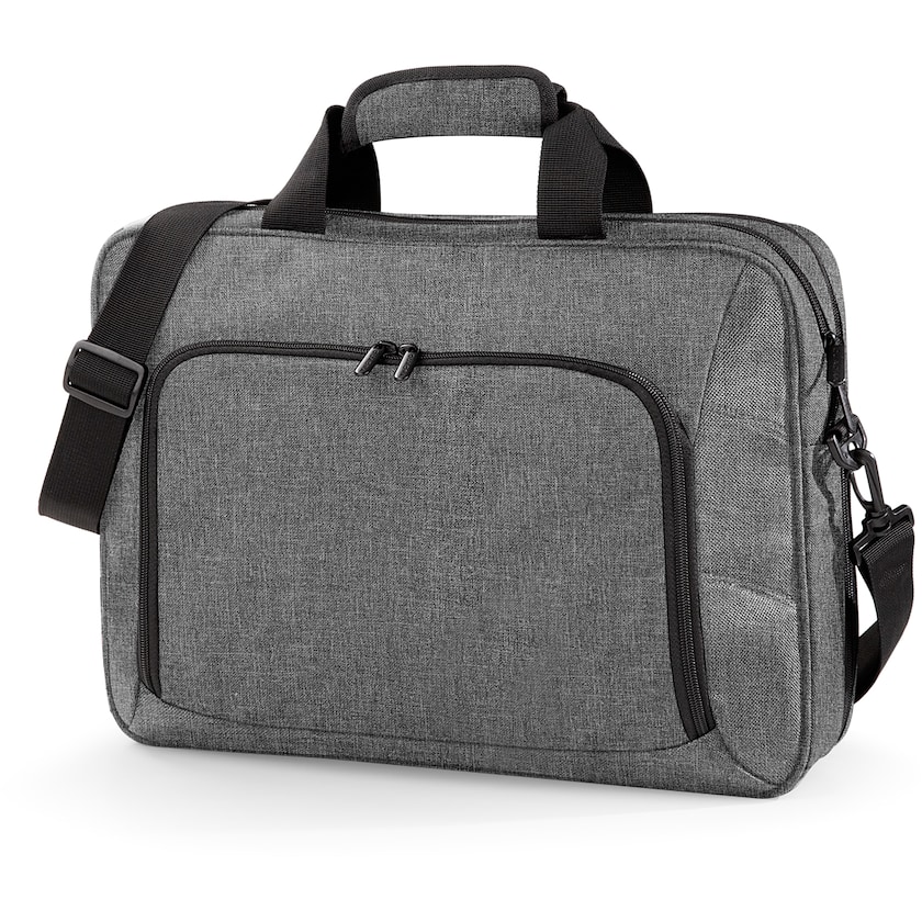 Sacoche haut de gamme pour ordinateur portable avec trois compartiments. La sacoche possède un compartiment matelassé qui convient à la plupart des ordinateurs portables jusqu'à 17 pouces ainsi qu'un compartiment matelassé pour iPad mini. Il a une poche à fermeture éclair sur le devant et une attache pour bagage à roulettes à l'arrière.
