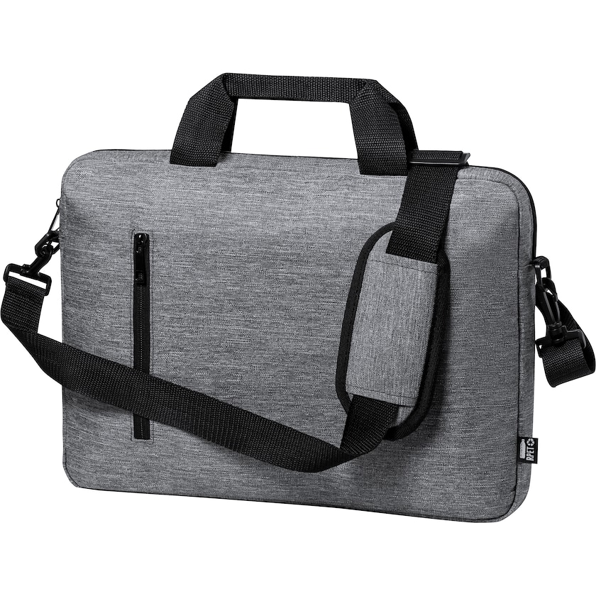Sacoche d'ordinateur portable abordable en matériau recyclé. À l'intérieur, un compartiment matelassé permet de ranger un ordinateur portable de 15 pouces, et une tablette de 10 pouces. La sacoche est en rPET, c'est-à-dire en bouteilles PET recyclées.