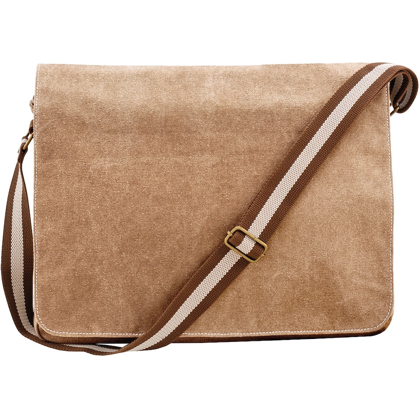 Sac à bandoulière classique en toile de coton épaisse. Les bretelles sont réglables et le sac possède de beaux détails en métal au finish antique. Le compartiment principal est équipé d'une fermeture éclair. L'arrière possède deux poches pratiques à l'arrière. Un beau sac de style rétro!