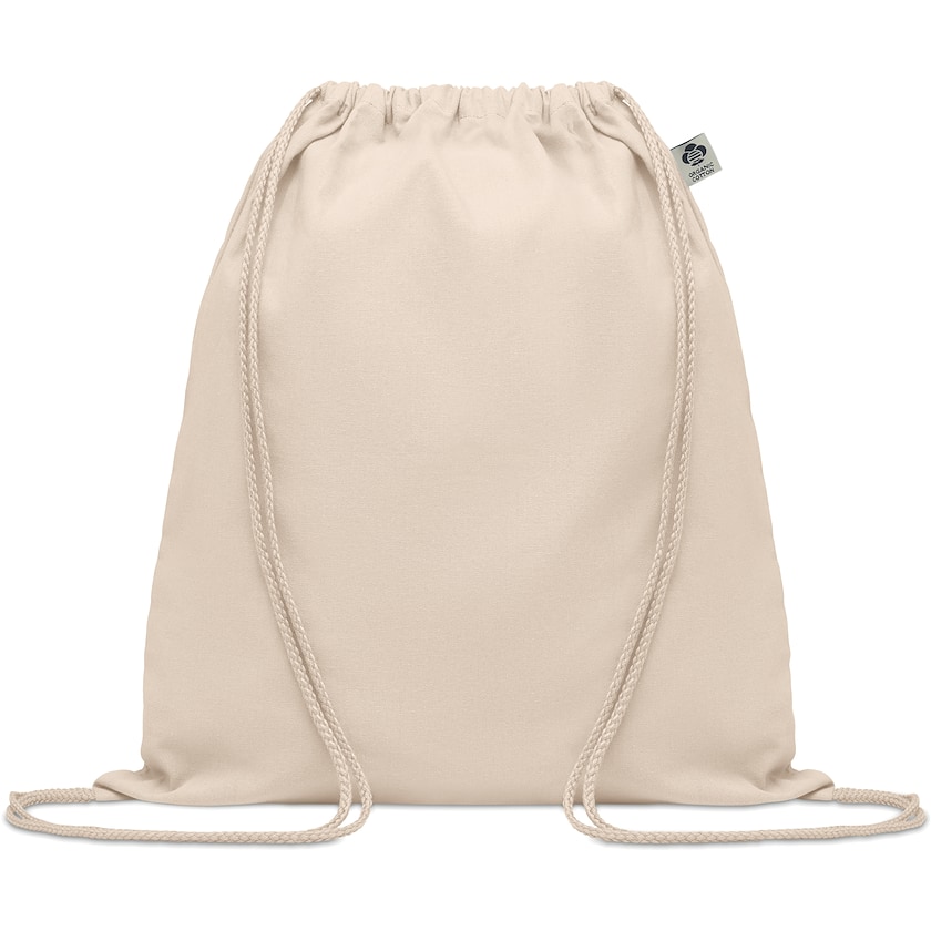 Sac de sport couleur nature en coton écologique. Le tissu possède une épaisseur de 140 grammes / m². Un des côtés porte une étiquette qui indique que le sac de sport est fabriqué en coton écologique.
