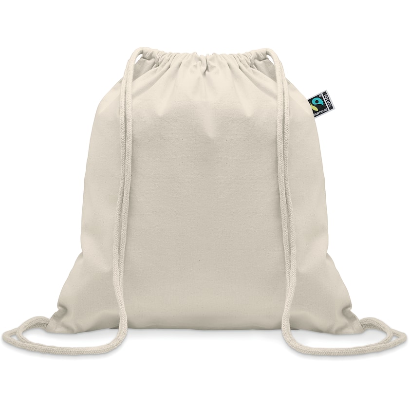 Sac de sport en coton certifié commerce équitable. Le tissu pèse 180 grammes par mètre carré. Sur un côté, une étiquette indique que le sac de sport est fabriqué à partir de coton certifié commerce équitable.
