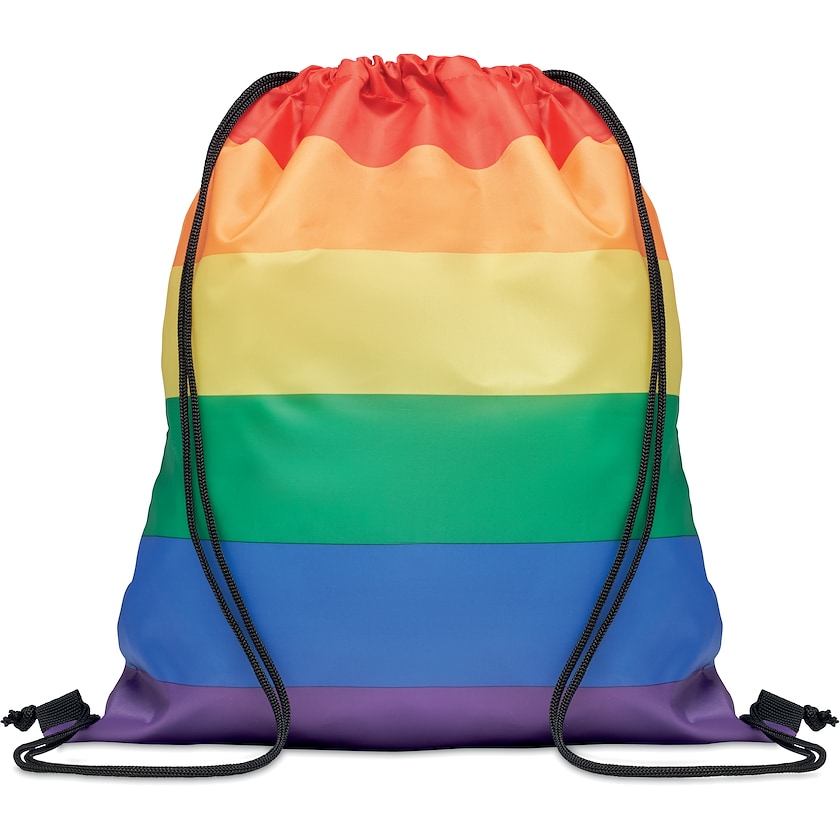 Sac de sport personnalisable couleur arc-en-ciel. Le Molina est fabriqué en rPET 210D, un matériau écologique fabriqué à partir de bouteilles PET recyclées. Les cordons sont en polypropylène.