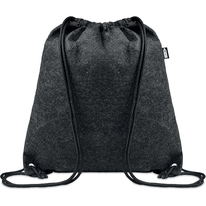Sac de sport écologique en feutre. Le tissu est fabriqué en rPET (c'est-à-dire en bouteilles PET recyclées), les cordons en polyester. Sur le côté, une étiquette indique que le tissu est en rPET.