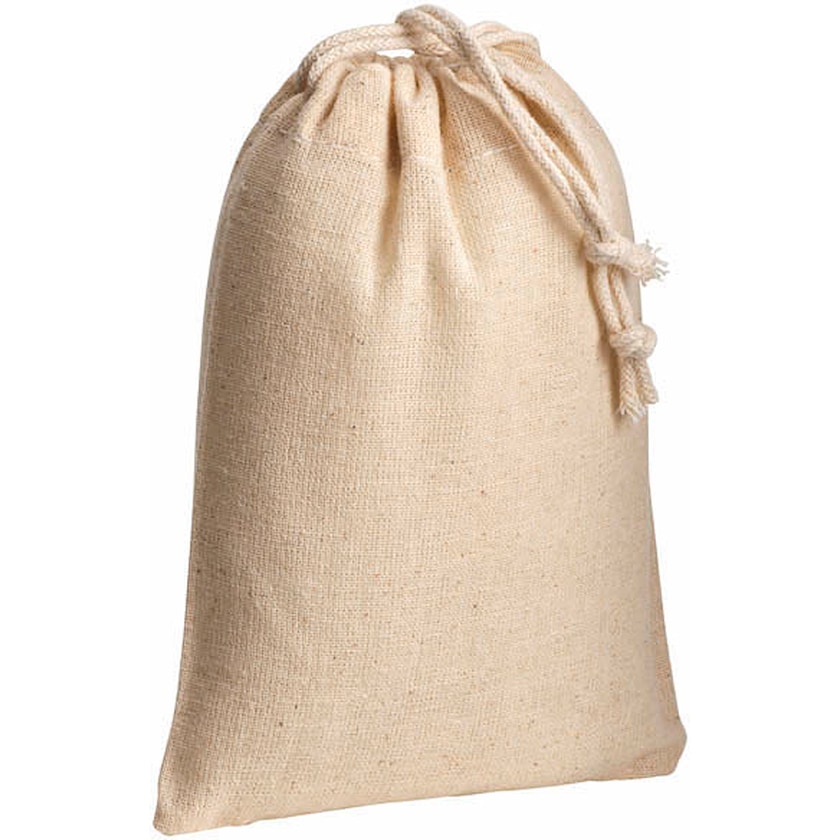 Petit sac en toile de coton nature de 120 grammes. Le sac possède des cordons sur le dessus. Son format est parfait pour y ranger des bijoux.