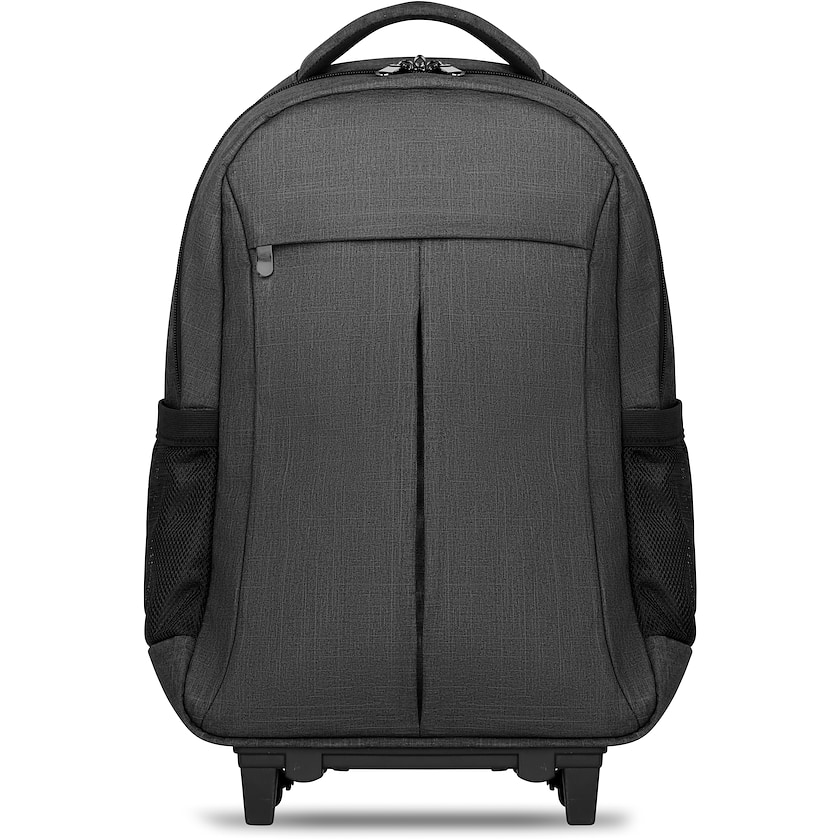 Sac à dos avec roulettes. À l'intérieur, deux compartiments permettent de ranger un ordinateur portable de 15 pouces et une tablette respectivement. Sur le devant se trouve une poche de rangement avec fermeture éclair. Une protection pour les roues est incluse afin d'éviter de se salir lorsque l'on porte le sac à dos.