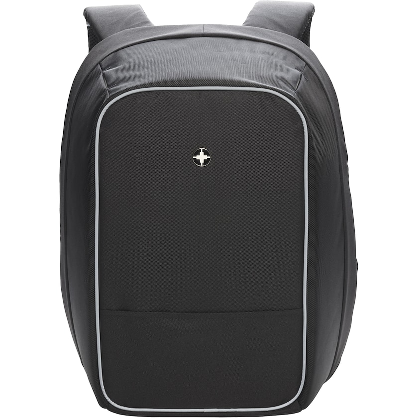 Sac à dos antivol écologique Swiss Peak. Le sac à dos possède un compartiment matelassé pouvant contenir un ordinateur portable 15,6 pouces. Le sac à dos est équipé de fermetures éclair et de compartiments cachés. Le devant du sac à dos présente une bande réfléchissante qui améliore la visibilité de son porteur dans l'obscurité. Design déposé®.
