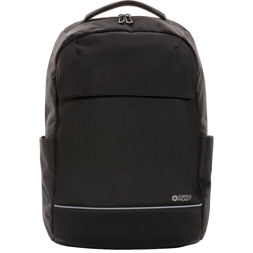 Sac à dos élégant pour ordinateur Swiss Peak. À l'intérieur se trouve un compartiment rembourré pour un ordinateur portable de 15,6 pouces. Le sac à dos est fabriqué en rPET (bouteilles PET recyclées) et constitue donc un bon choix environnemental.