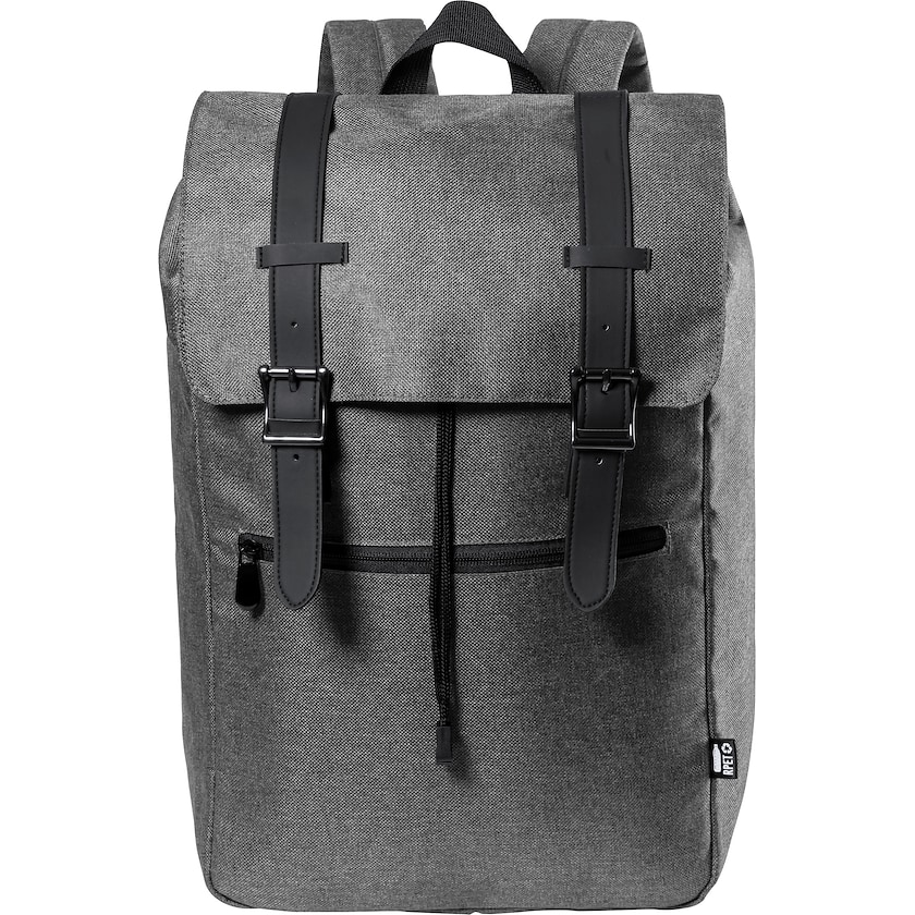 Sac à dos pour ordinateur portable de conception classique, fabriqué à partir de matériaux recyclés. Le sac à dos est doté d'un compartiment rembourré pour un ordinateur portable de 15 pouces et d'un compartiment pour une tablette de 12 pouces. Le tissu est fabriqué à partir de rPET, c'est-à-dire de bouteilles PET recyclées. Une petite poche zippée se trouve à l'avant.
