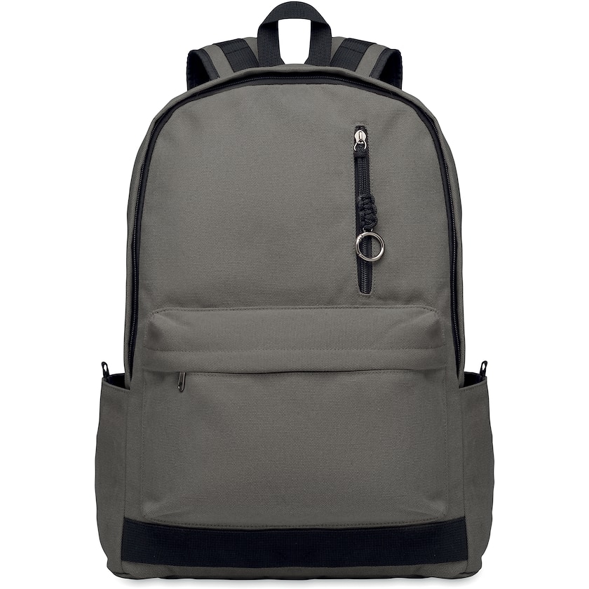 Sac à dos pour ordinateur en tissu de coton recyclé. A l'intérieur se trouve un compartiment pour un ordinateur portable de 15 pouces. Sur le devant il y a une grande poche zippée et sur les côtés il y a des poches sans fermeture éclair.
