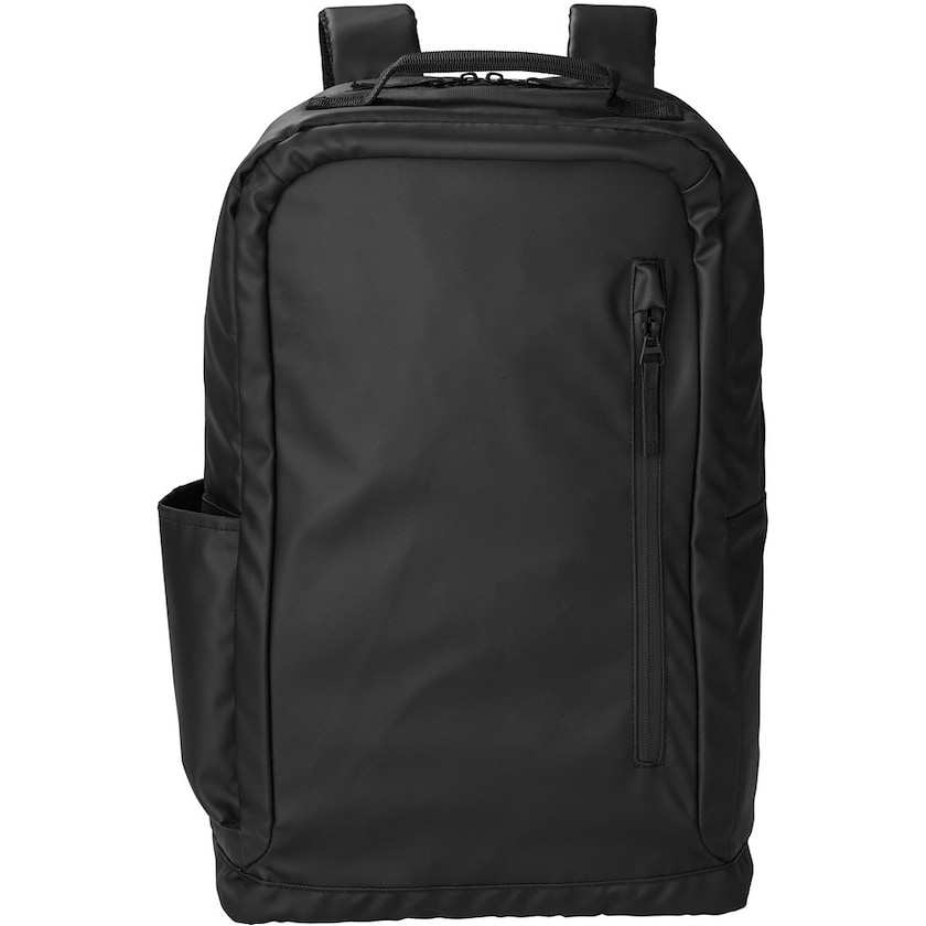 Sac à dos pour ordinateur en tissu déperlant. A l'intérieur se trouve un compartiment pour un ordinateur portable de 15 pouces. Il y a une poche zippée sur le devant et une poche pour une bouteille d'eau sur un côté. Le sac à dos est également équipé d'une poche antivol.