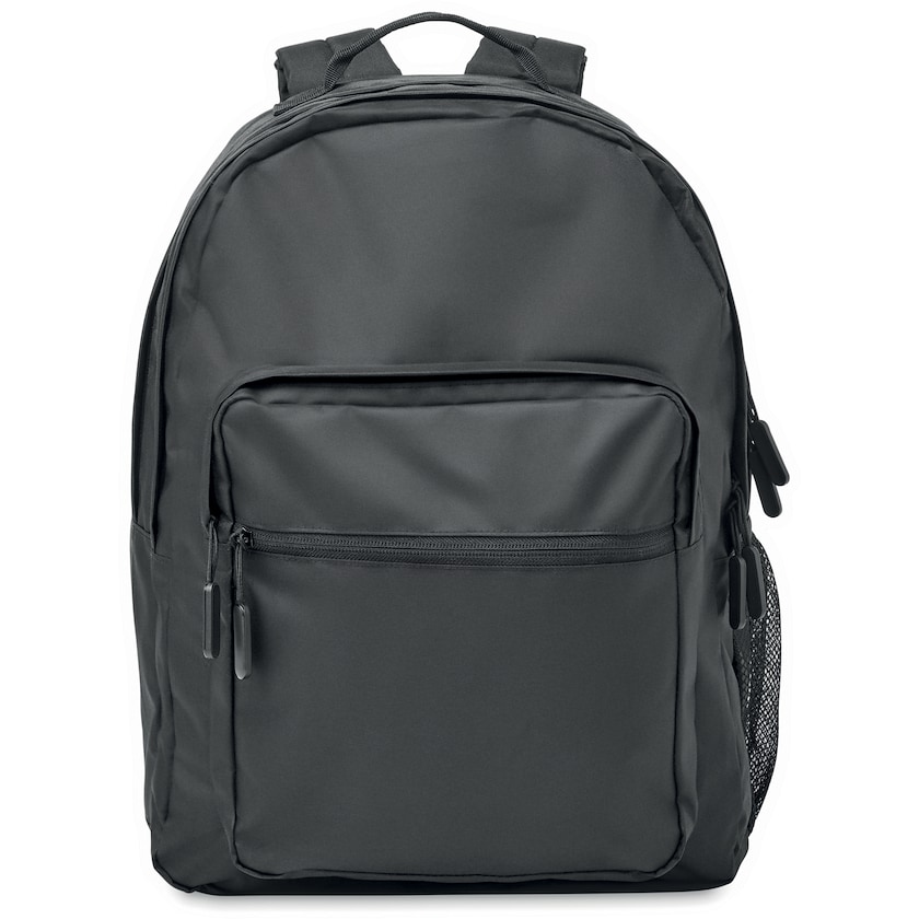 Sac à dos pour ordinateur imprimé avec du tissu RPET recyclé. À l'intérieur se trouve un compartiment rembourré pour un ordinateur portable de 15 pouces. Le sac à dos comporte deux grands compartiments zippés, deux poches de rangement à l'avant et une poche en filet sur un côté. Le dos et les bretelles sont rembourrés.