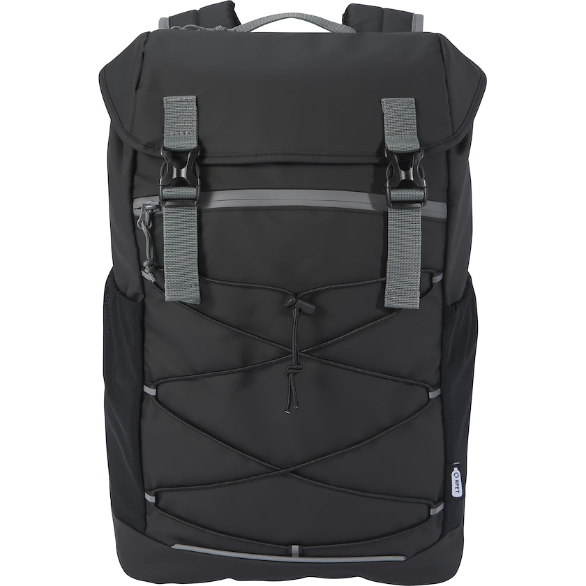 Sac à dos pour ordinateur en tissu imperméable en polyester recyclé. A l'intérieur se trouve un compartiment pour un ordinateur portable de 15,6 pouces. Sur le devant se trouve une poche avec fermeture éclair. Le dos et les bretelles sont bien rembourrés.