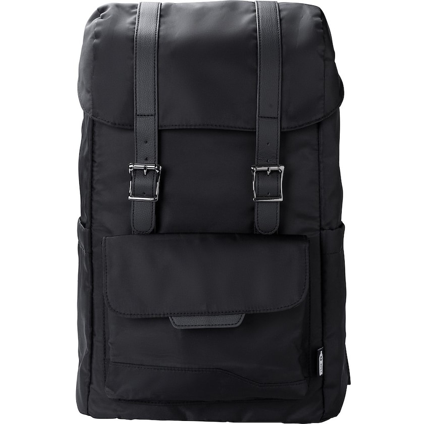 Sac à dos pour ordinateur d'inspiration rétro en tissu recyclé et déperlant. À l’intérieur se trouve un compartiment rembourré pour un ordinateur portable de 15 pouces. Le couvercle est maintenu fermé par une serrure magnétique.