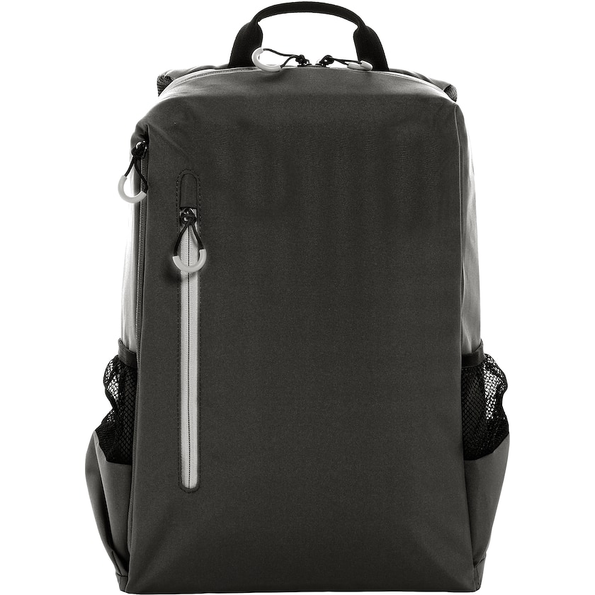 Sac à dos écologique pour ordinateur portable écologique. Le Stewart possède un compartiment matelassé pour ordinateur portable 15,6 pouces. Sur le devant, vous trouverez une petite poche à fermeture éclair, tandis que sur les côtés des poches latérales permettent de ranger des bouteilles d'eau. Le tissu est fabriqué en 100% polyester recyclé.