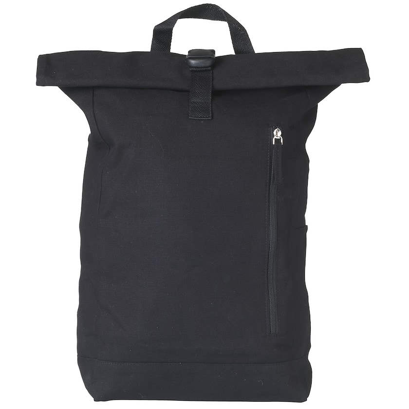 Sac à dos roll top en toile canvas épaisse. Le sac possède deux poches : une petite sur l'un des côtés, une grande sur le devant avec fermeture éclair. Impression monochrome uniquement.