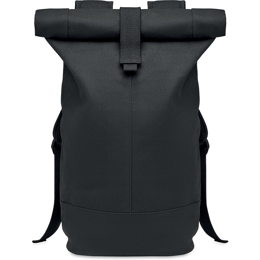 Sac à dos roll top en toile canvas noire. Le tissu du sac à dos pèse pas moins de 340 grammes / m². L'arrière du sac à dos est matelassé pour un port plus confortable. Le rembourrage est en rPET écologique.