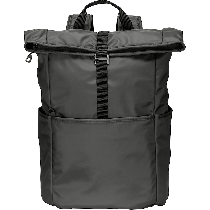 Sac à dos enroulable en matériau durable. À l'intérieur, une poche peut accueillir un ordinateur portable de 15 pouces. Le rabat se ferme grâce à un crochet métallique qui maintient le sac à dos en place lorsqu'il est enroulé. Une poche zippée est présente à l'avant et des poches latérales sur les côtés. Le dos et les bretelles sont rembourrés et respirants pour un confort de port optimal.