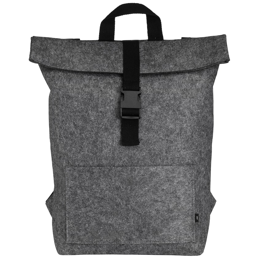 Sac à dos roll top en feutre fabriqué à partir de matériaux recyclés. Le tissu est fabriqué à partir de bouteilles PET recyclées, et est très résistant. Sur le devant se trouve une petite poche de rangement. Impression monochrome uniquement.