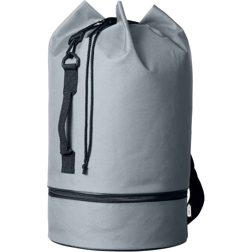 Sac marin écologique en tissu imperméable. Le compartiment principal possède une contenance de 20 litres, ainsi qu'une petite poche séparée avec fermeture éclair. Le sac marin est équipé d'une bandoulière réglable. Le tissu est fabriqué à partir de plastique PET recyclé.