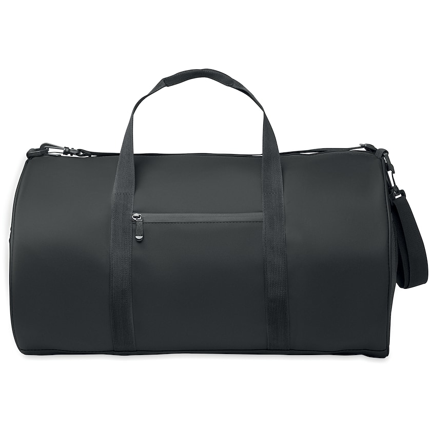 Sac de sport fabriqué à partir de matériaux recyclés. À l'avant, sur le côté court et à l'intérieur, il y a une petite poche avec une fermeture éclair.