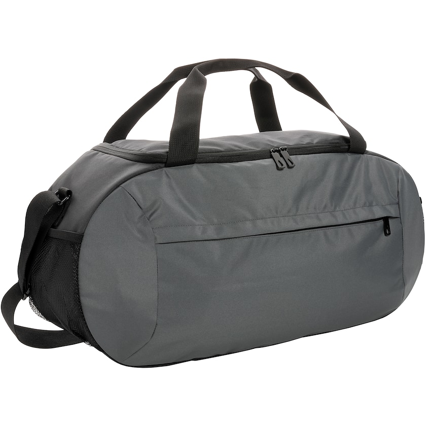 Sac de sport écologique en rPET. Le sac possède un design épuré et moderne, avec un grand compartiment principal et une petite poche de rangement sur l'un des côtés. Un sac de sport bien conçu et un bon choix écologique !