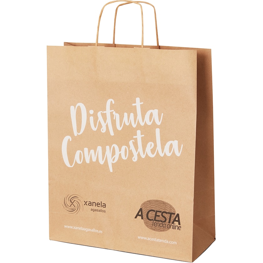 Sac en papier couleur nature avec extérieur entièrement personnalisable. Le sac en papier est fabriqué à partir de 100 grammes de papier couleur nature. Ses anses sont torsadées. L'intégralité du sac en papier est personnalisable suivant vos souhaits. Téléchargez simplement le template d'impression et créez votre design personnalisé ! La quantité minimum de commande est de 3000 unités.