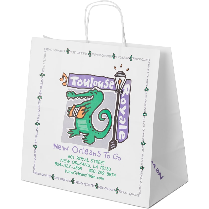 Sac en papier avec personnalisation de toute sa surface extérieure. Le sac en papier est fabriqué à partir de papier lisse de 100 grammes d'épaisseur, et pourvu d'anses torsadées. Téléchargez le template d'impression et concevez votre propre sac en papier. La quantité minimum de commande est de 3000 unités. La production peut donner lieu à un nombre correspondant à +/15% de la commande. La quantité effectivement produite sera celle facturée.