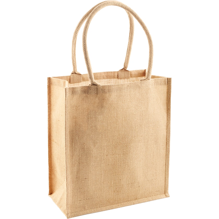Sac en toile de jute laminé avec anses en coton. Le sac peut être porté à la main ou à l'épaule. L'impression peut être réalisée en deux couleurs maximum.