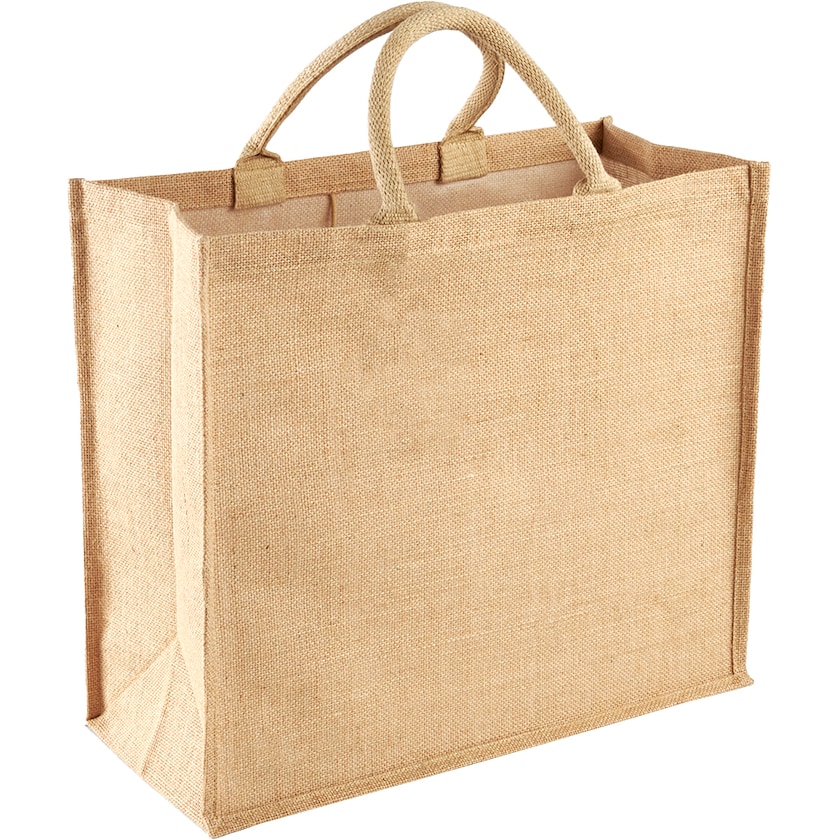 Grand sac en toile de jute avec tissu laminé. Le laminage rend le sac plus résistant. Les poignées sont en coton et mesurent 37 cm de long. Le coût de la broderie est valable pour 10 000 points maximum. Le jute est un matériau naturel fantastique, qui est entièrement biodégradable.